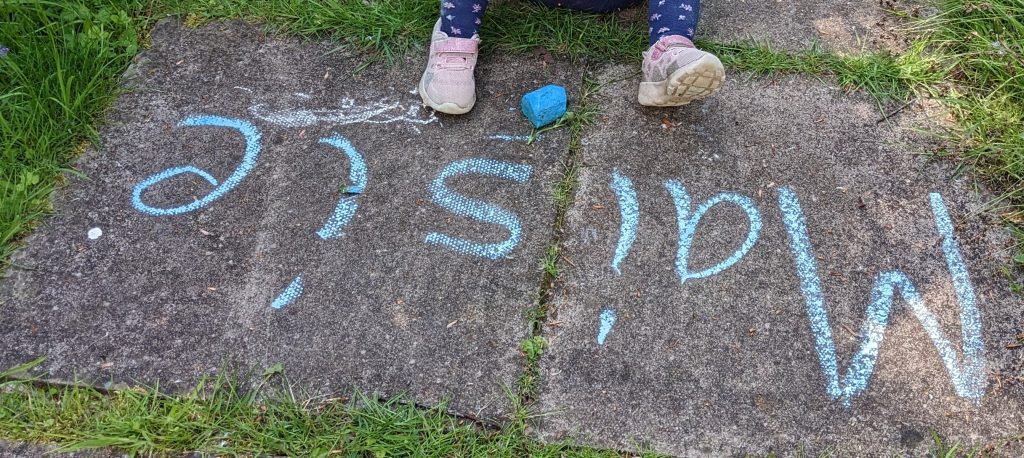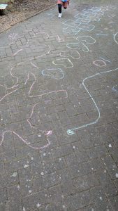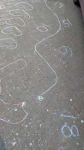7. Alphabet or Number Hunt: If your little one is learning to recognise the alphabet, write some letters on the ground round the garden and call a letter out. They have to run to that letter. They could even have a go at tracing the letter themselves over the top with a piece of chalk or write it next to yours. You could also do this to practise numbers. This was ours. My 6-year-old came and joined in too so we added bigger numbers to the pavement.