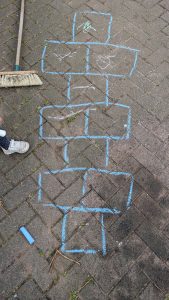 4. Hopscotch: Go old-school and draw a hopscotch. For a bit of a challenge, they throw a stone and have to hop over that number once they get to it.