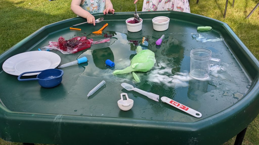 This is a such a fun activity. We usually do this outside. I set it out on a table and my 3-year-old just loves doing her dishes.