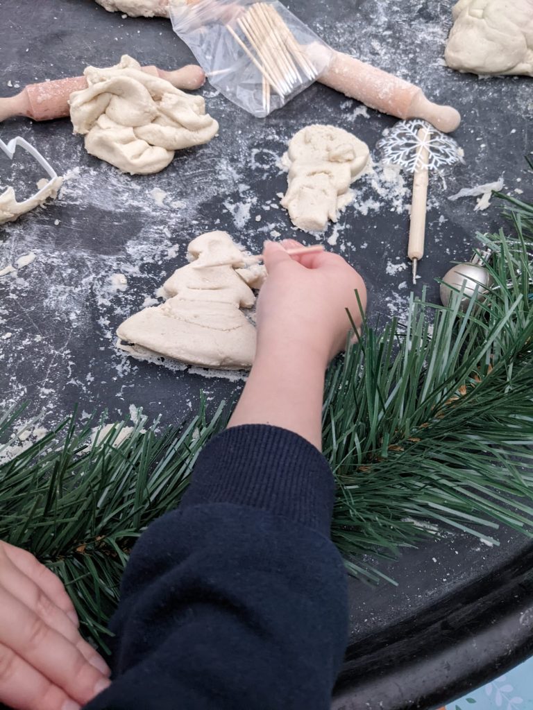 Provide some white playdough, or even red or green to keep in the Christmas theme, some Christmas cookie cutters and rolling pins and see what your littles can make.