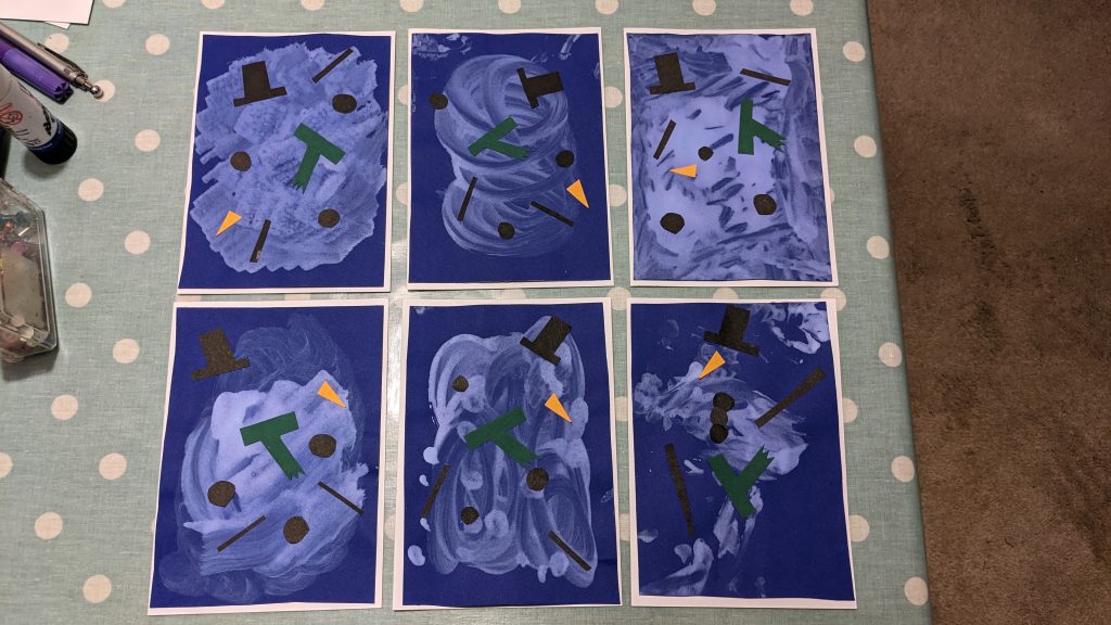 This smells divine! It’s hair conditioner mixed with cornflour. It is a bit crumbly and so is great for making snowy scenes and children can have a go at making snowmen in the ‘snow’.