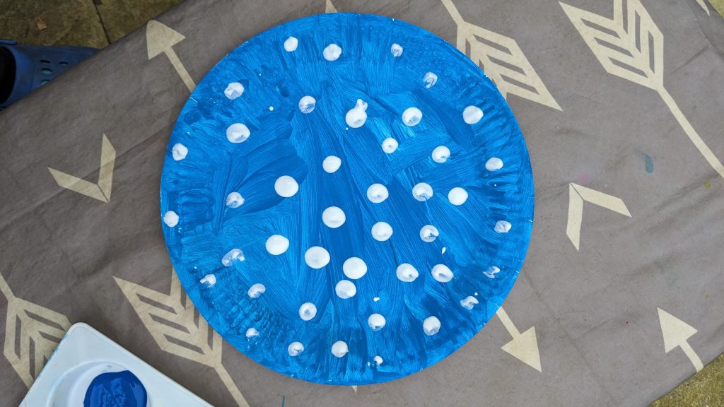 Get a paper plate and paint it blue. When dry, add dots of white paint. My two loved doing this as finger painting. Take a photo of your little one all bundled up in their winter coat, gloves, hat and scarf. I got mine to do a jump. Go into Canva and delete the background. Print the picture out and stick it onto your blue, snowy background.