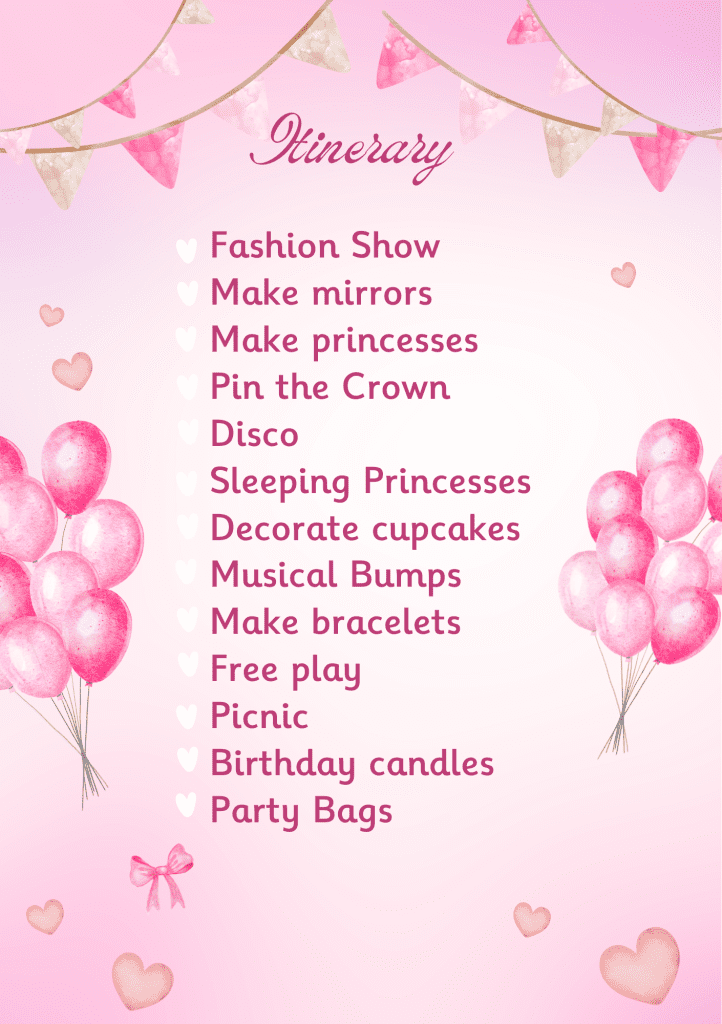 I created an itinerary to make sure we kind of kept to the plan so we could fit as many of our planned activities in. The theme of our party was ‘Princesses’ so I ran with that theme of used Pinterest and Google to get ideas for activities and games.