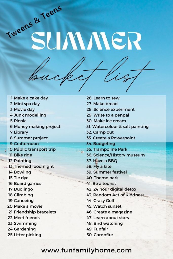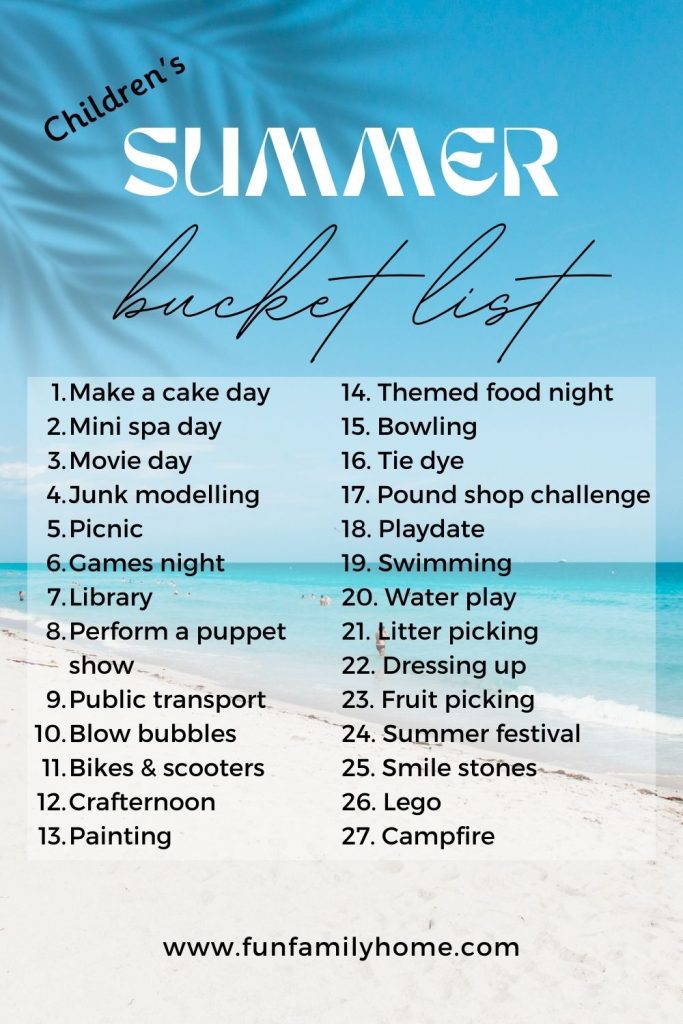 A summer bucket list is a list of ideas for activities over the summer. It’s a list of activities that the kids want to do and it helps focus the mind to plan everything into your summer with them. It gives each day a meaning so you don’t just fall into the habit of staying at home every day and not spending the days to the best of your abilities.