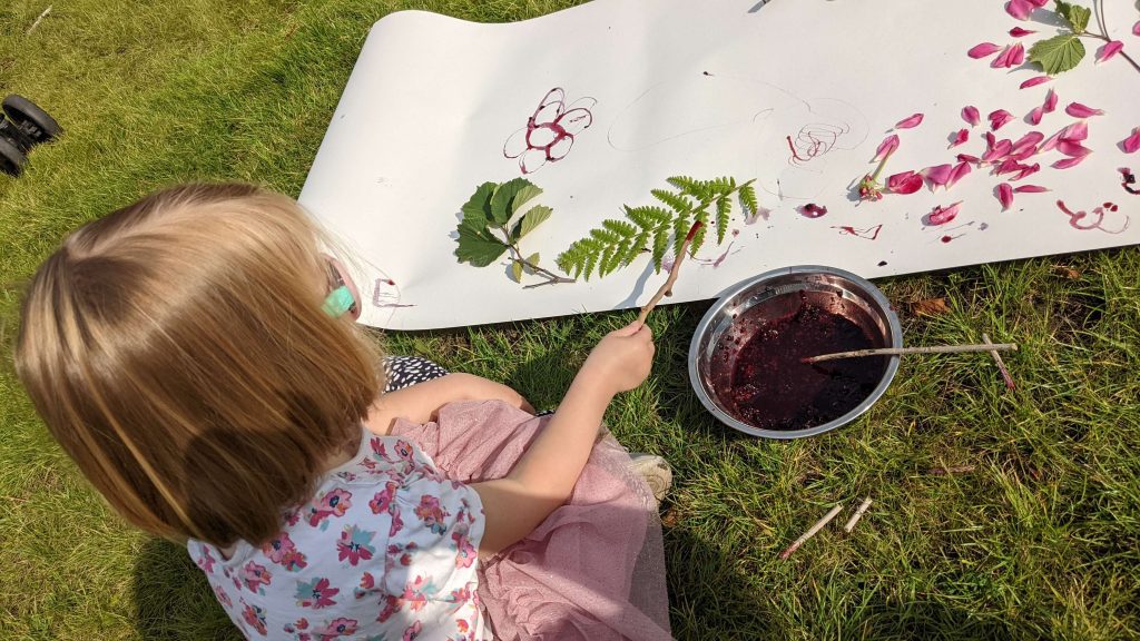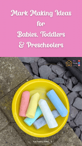Mark-making can be done inside or outside. Provide or find opportunities for them wherever you are: if you’re at the park, can they use a stick to make lines on the path? If you’re in the garden, can they make a picture using flowers and grass? If you’re inside, can they use a lolly-stick to make marks in their playdough? There are so many opportunities for mark-making and there is a list further down the page for ideas.