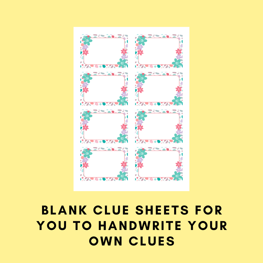 There’s also 8+ blank clue sheets for you to add your own handwritten clues on.