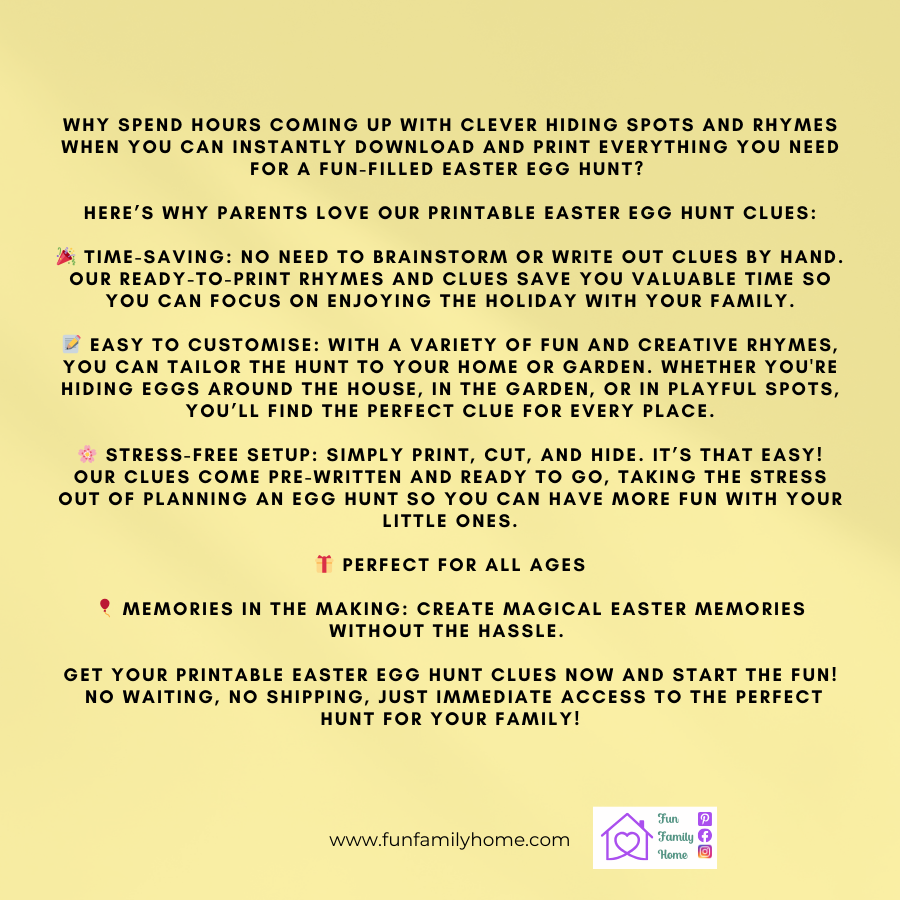 📝 Easy to Customise: With a variety of fun and creative rhymes, you can tailor the hunt to your home or garden. Whether you’re hiding eggs around the house, in the garden, or in playful spots, you’ll find the perfect clue for every place.