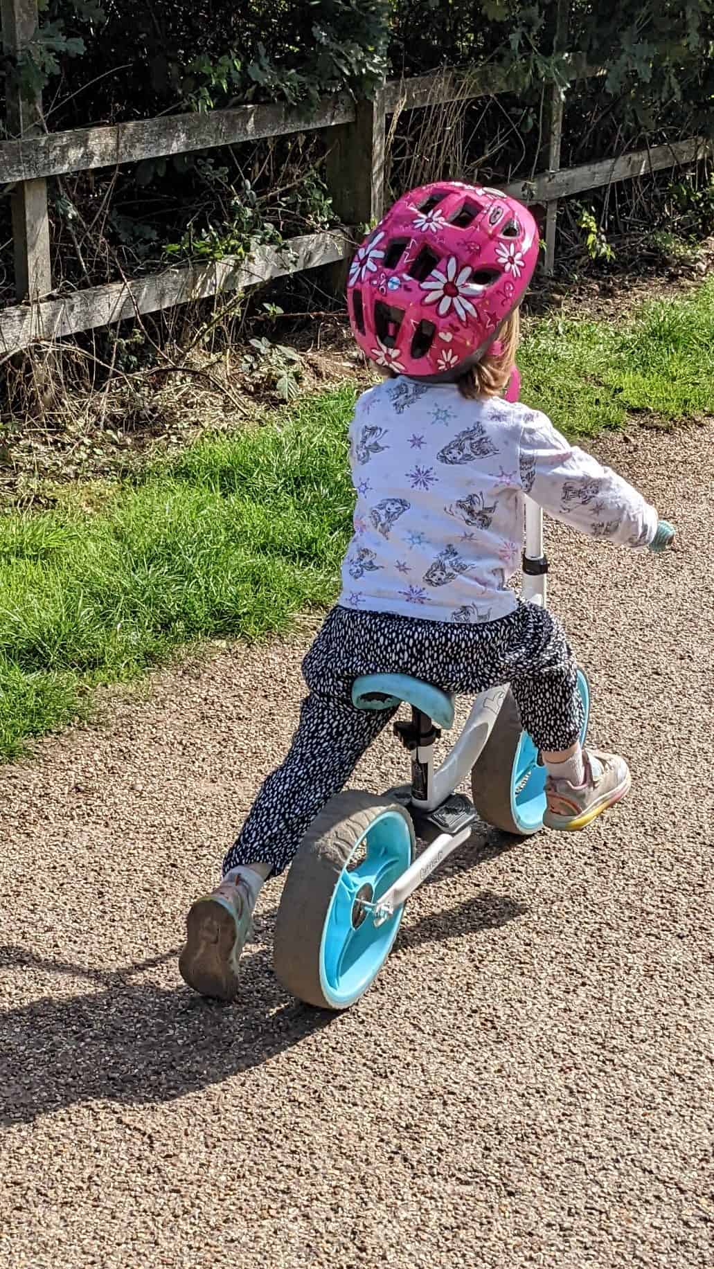We gave our first daughter a balance bike for her second Christmas and a scooter for her second birthday following that. Our daughter gets to choose whether we take her bike or scooter with us when we go to the park. Both are good exercise for little ones. She has a helmet which she wears when she’s on them as well to keep her little head safe from bumps.